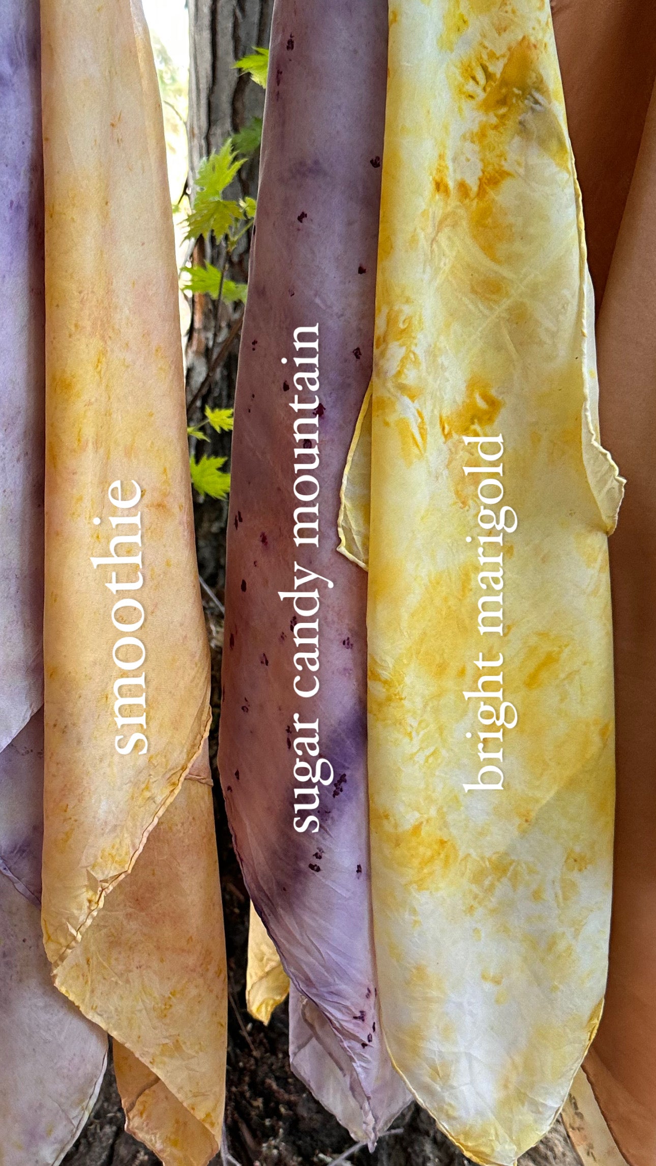 hand dyed under the high desert sun .:. woven in love, care, & prayer :.. these summer colors are pot or bundle dyed — bundle dye an intuitive process of laying and arranging plant material directly on the silk for rich color and a unique to every dyer & batch organic patterning :…