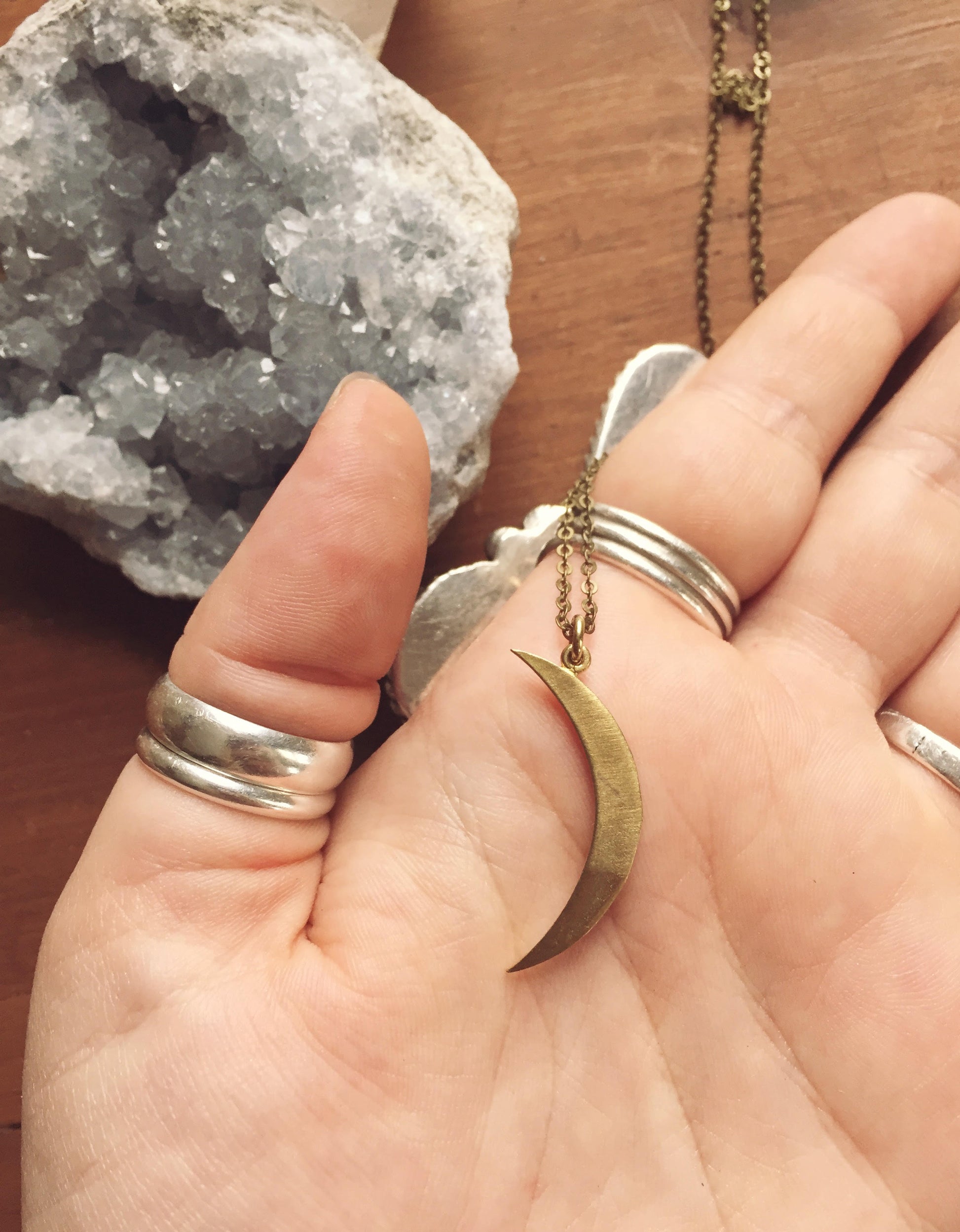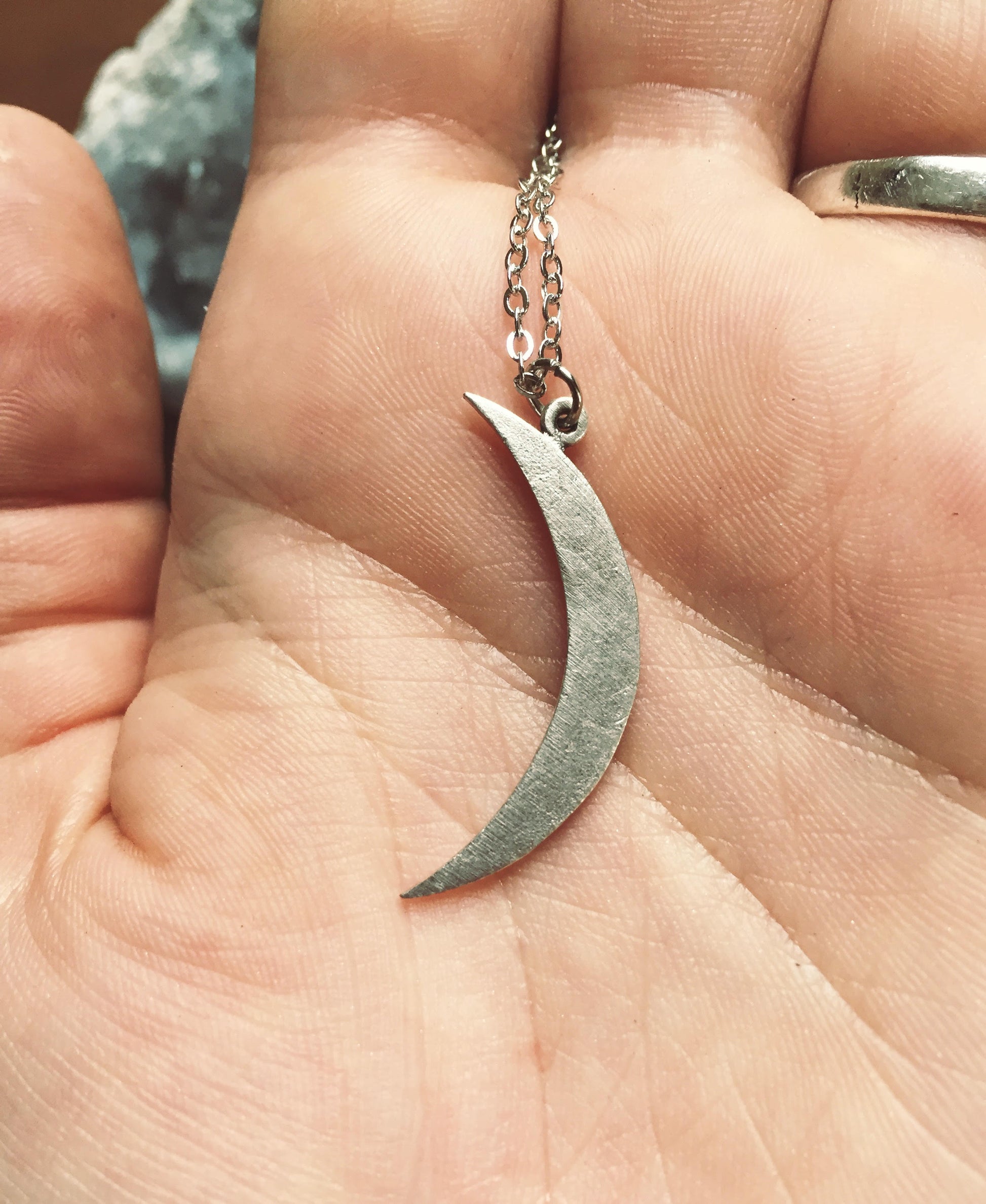 "brushed silver brass" ~ brass hand crafted crescent moon. sort of a dark, gunmetal silver finish. will acquire a beautiful, natural patina over time with the oils that occur naturally in our skin.