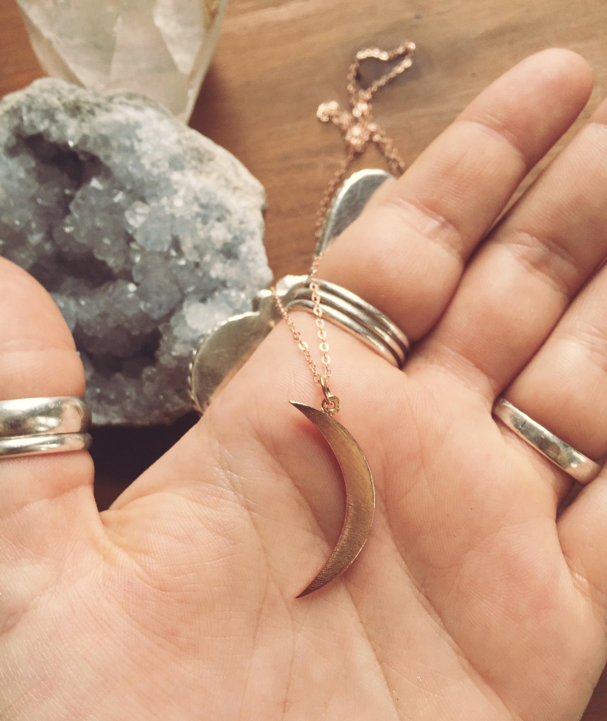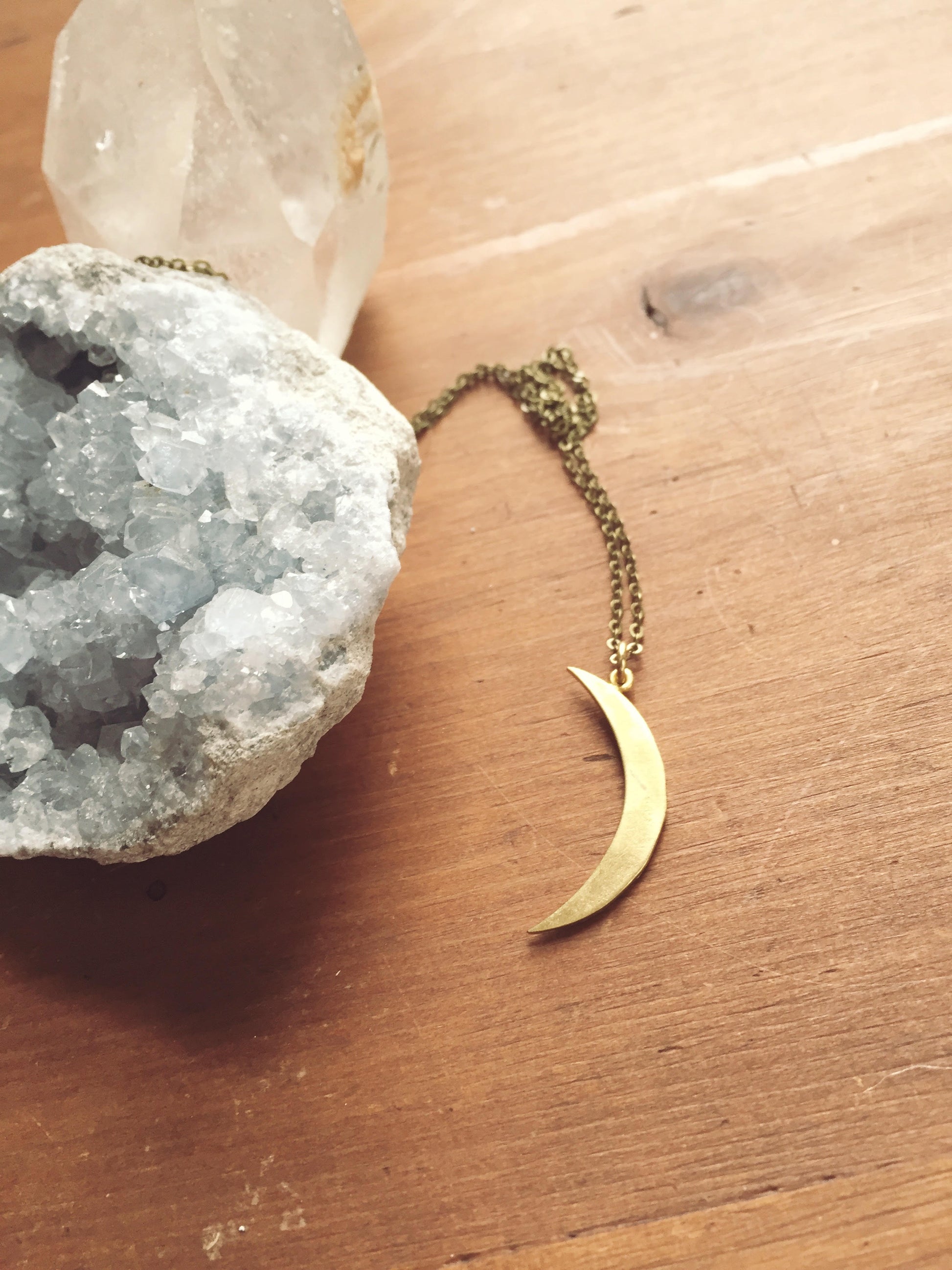 "earthy gold brass" ~ brass handcrafted crescent moon. patined a dark, earthy gold, will acquire a beautiful, natural patina over time with your natural skin oils.