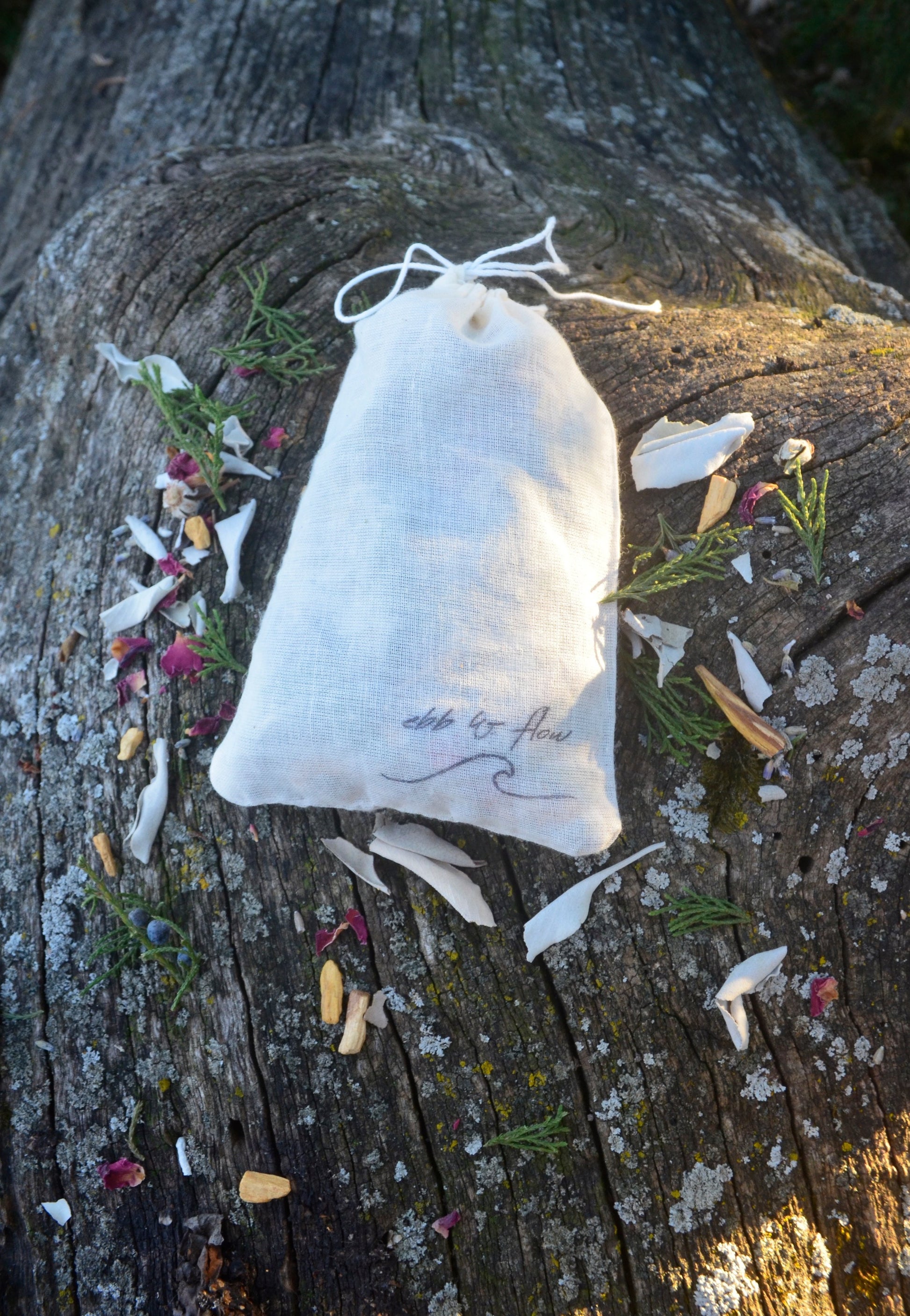 this is for 1/2 oz of Ebb & Flow's signature sacred smudge blend made of homegrown juniper leaves and berries, wild white sage, sustainably harvested palo santo chips, organic roses, & organic lavender