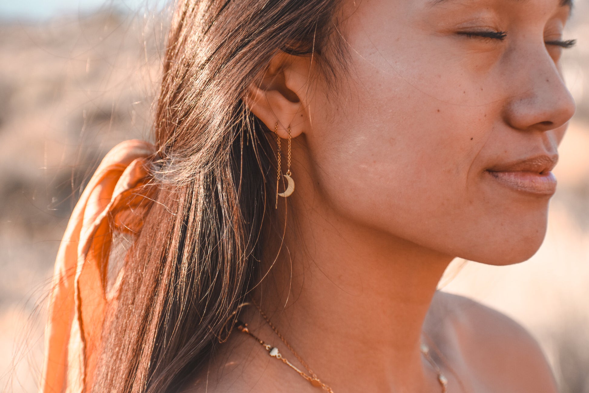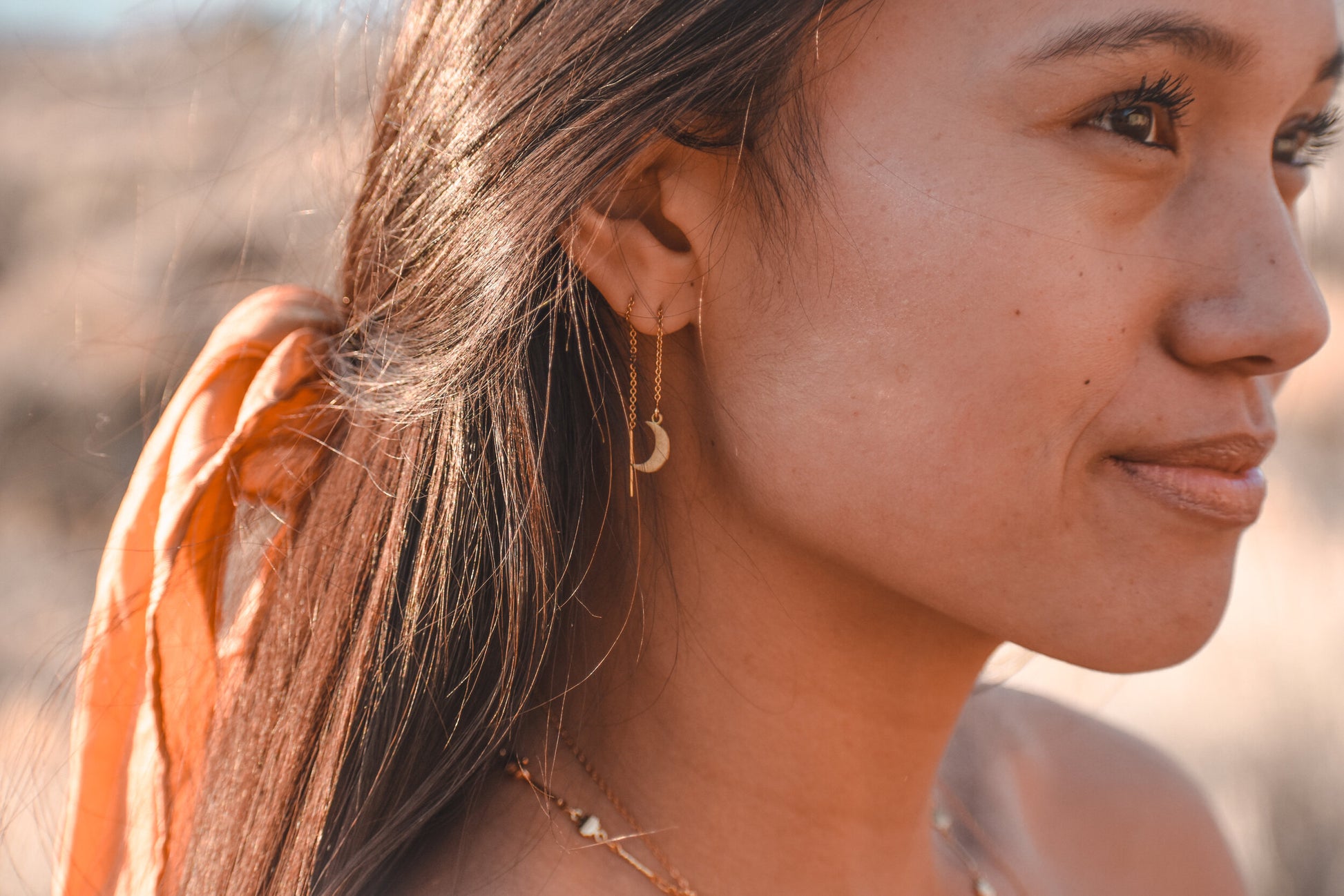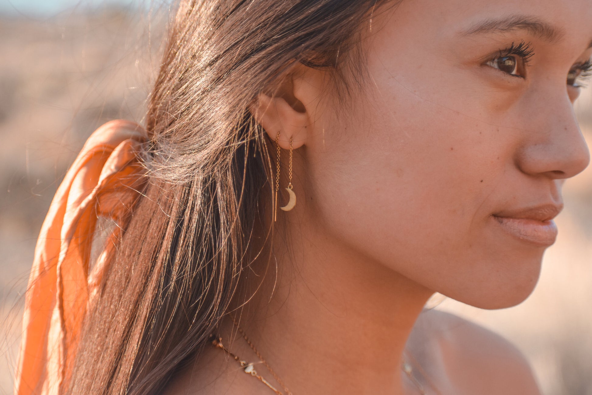 gold fill threader base accented with raw brass cast moons that can be polished to a shine.
